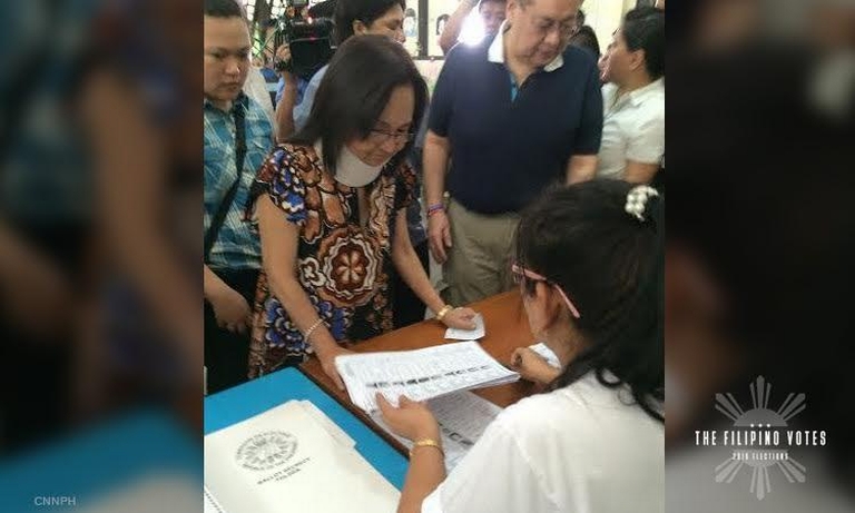 Former president Gloria Macapagal Arroyo casts her vote. She is running unopposed as Lubao district representative.