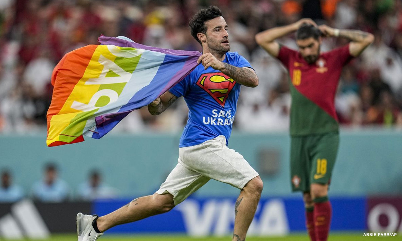 This story was first published on CNN.com, “Pitch invader with rainbow flag interrupts World Cup match between Portugal and Uruguay“