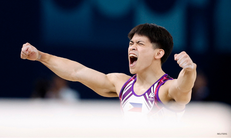 Filipino gymnast scores 15 points in the floor exercise final to win gold at the Paris 2024 Olympics. (Retuers/Amanda Perobelli)