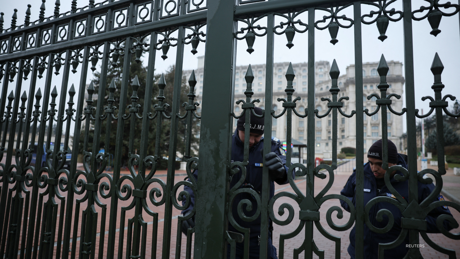 A Jandarmeria member closes a gate to the Palace of Parliament, after the Romanian top court annulled the result of the first round of the presidential election, in Bucharest, Romania, December 6, 2024. REUTERS/Louisa Gouliamaki
