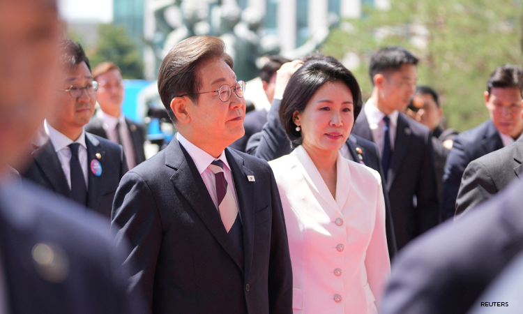 Newly elected South Korean President Lee Jae-myung, and his wife Kim Hye Kyung, arrive for the Presidential Inauguration at the National Assembly in Seoul, South Korea, Wednesday, June 4, 2025. Lee Jin-man/Pool via REUTERS