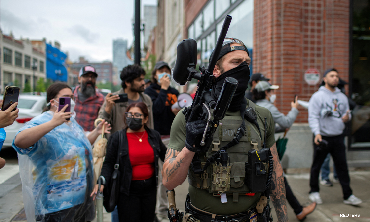 A federal agent with a pepper ball gun walks back to his vehicle after making immigration arrests in Chicago, Illinois, U.S. June 4, 2025. REUTERS/Jim Vondruska/File Photo