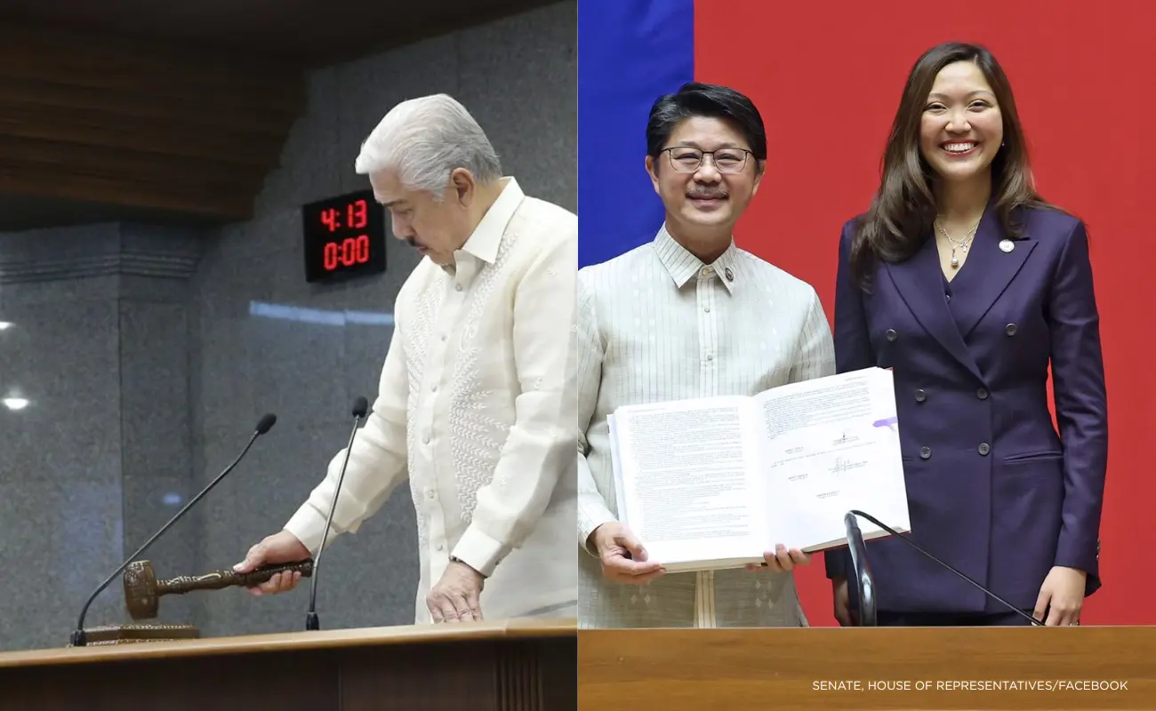 A composite photo of Senate President Vicente Sotto III, House Speaker Faustino Dy III, and House appropriations committee chairperson Mika Suansing inside their respective plenary halls to ratify the proposed 2026 budget. (Senate, House of Representatives/Facebook)