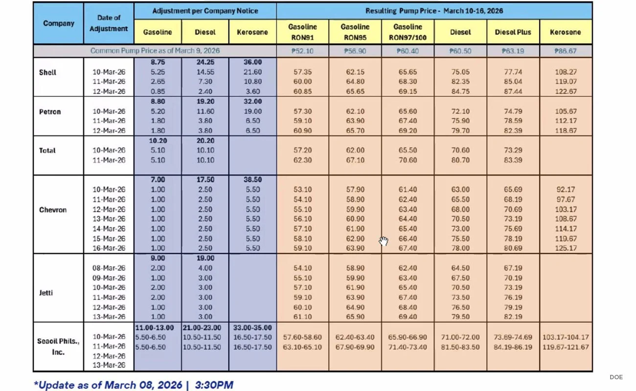 Manila, Philippines – Pump price hikes of up to P24.25 per liter will be rolled out in tranches beginning Tuesday, March 10, as part of contingency measures to soften the blow of rising global oil prices from the Middle East conflict, the Department of Energy said.